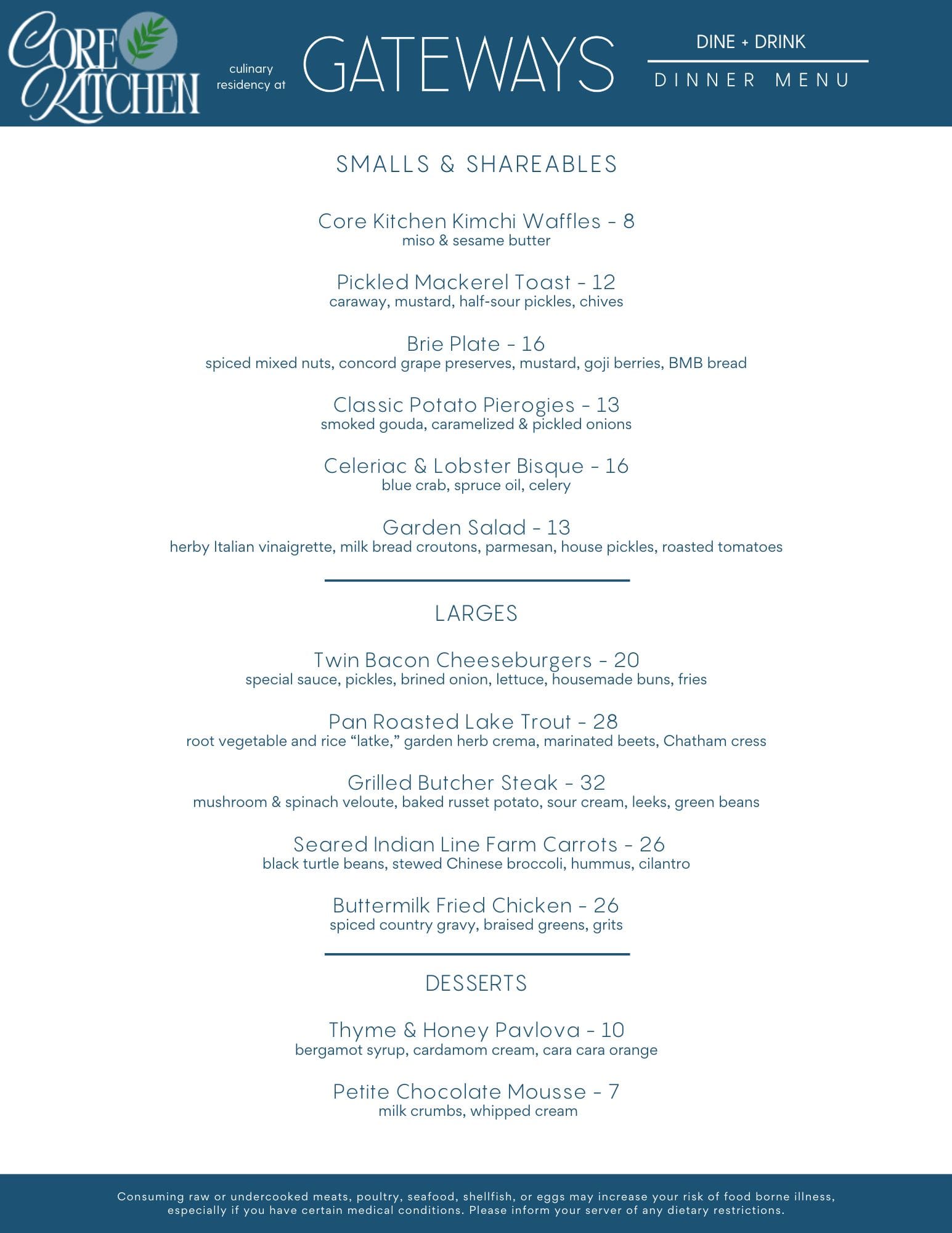 We will also have our standard a la carte menu available for your enjoyment. As always, menus are subject to changes and the most up-to-date version will be available on corekitchenfood.com.