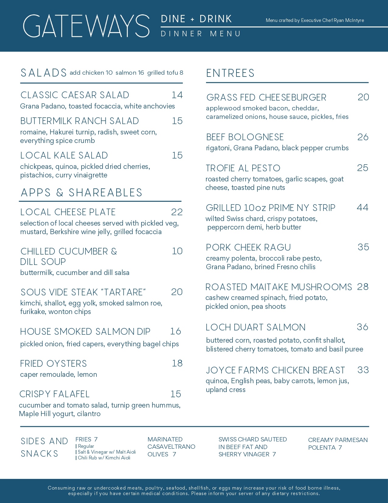 Gateways Dine and Drink is open to Inn guests and public patrons for the 2025 Summer and Fall Season, offering locally inspired dishes, fresh cocktails, a vast selection of wines and scotches, indoor and outdoor seating, and live music on weekends.
